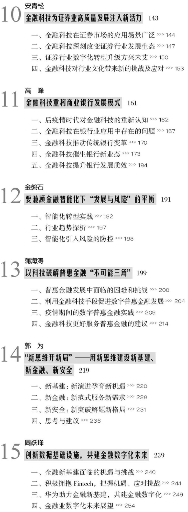 《金融科技15讲》的15位作者,有来自中国社科院、清华大学、中国工程院的研究者,有来自中国人民银行、中国证监会、中国银保监会的监管者,还有来自中国证券业协会、中国银行业协会、中国建设银行、腾讯、神州信息、华为的从业者。